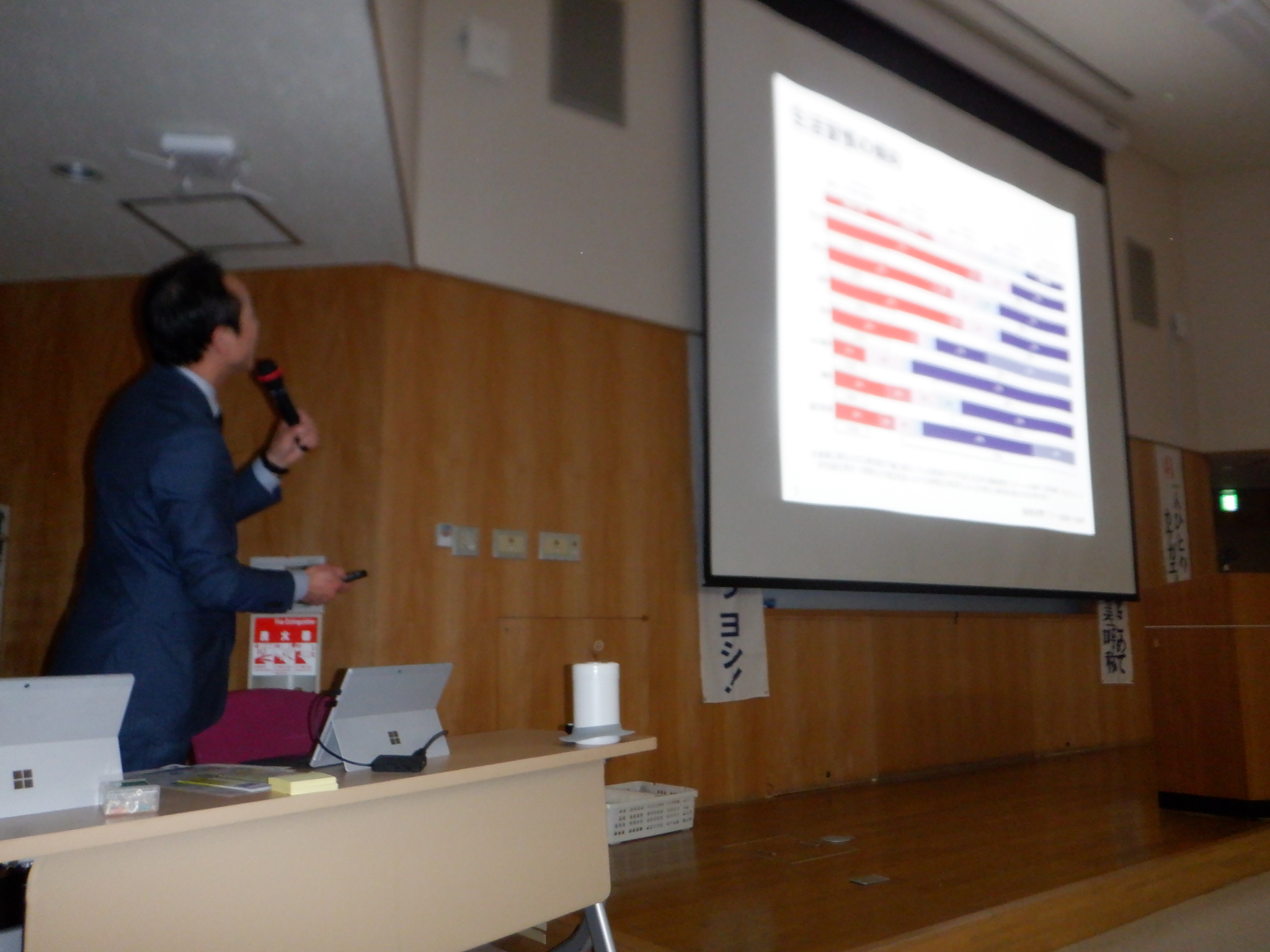 今までと内容を変え、今回はセミナーを2件実施。社会保険労務士 伊藤様より、『職場のパワーハラスメントを考える』と題しまして、講話をしていただきました。続いて、アクサ生命保険 濤岡様、新谷様より、以前実施したアンケートをもとに、人生100年時代に向けて長く働ける体づくりに関する講話をしていただきました。